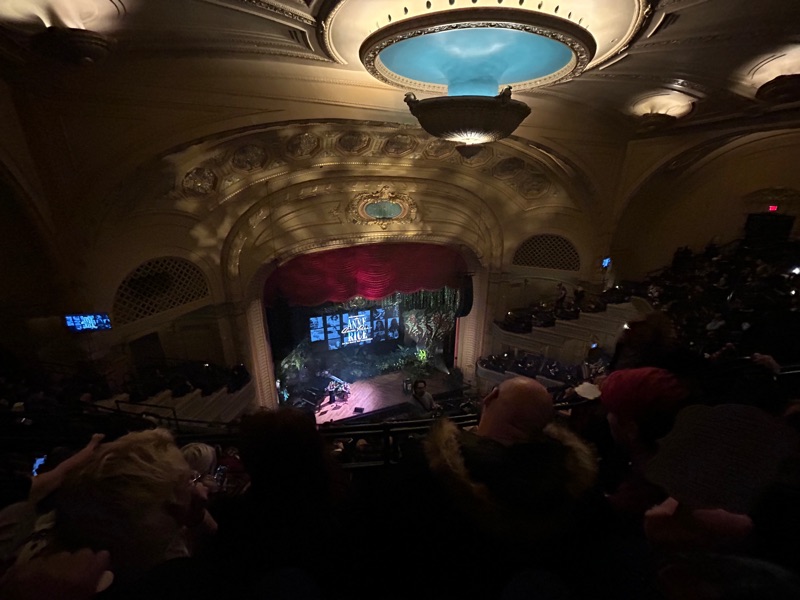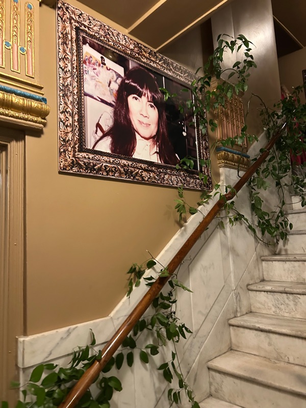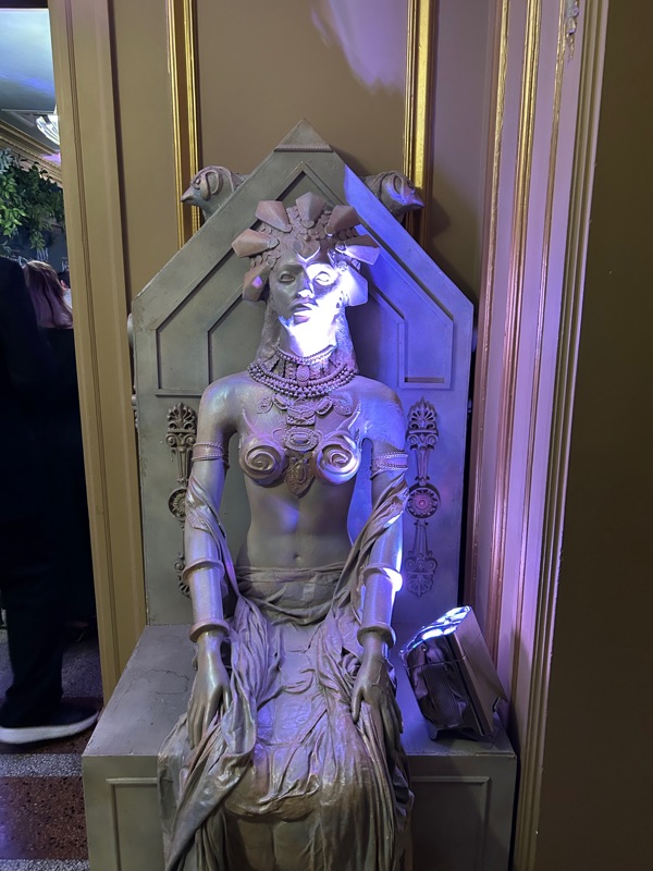 The venue itself is a beautiful old baroque-style theater which was decked out with wonderful old photos of Anne and other Rice-related decor, including life-sized replicas of Akasha and Enkil, the two progenitor vampires from her books. We had a pair of vertigo-inducing seats up on the nosebleeds, which required me to stare down through my progressive lenses with my glasses on the tip of my nose.